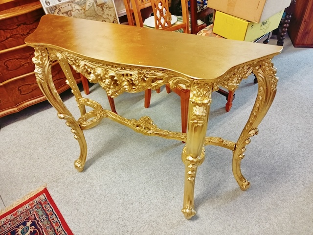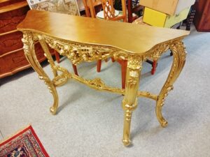 Hier haben wir das Gestell gereinigt und frisch lackiert, eine neue Platte oben aufgesetzt und diese dann mit Blattgold belegt. Das Ergebnis kann sich sehen lassen.